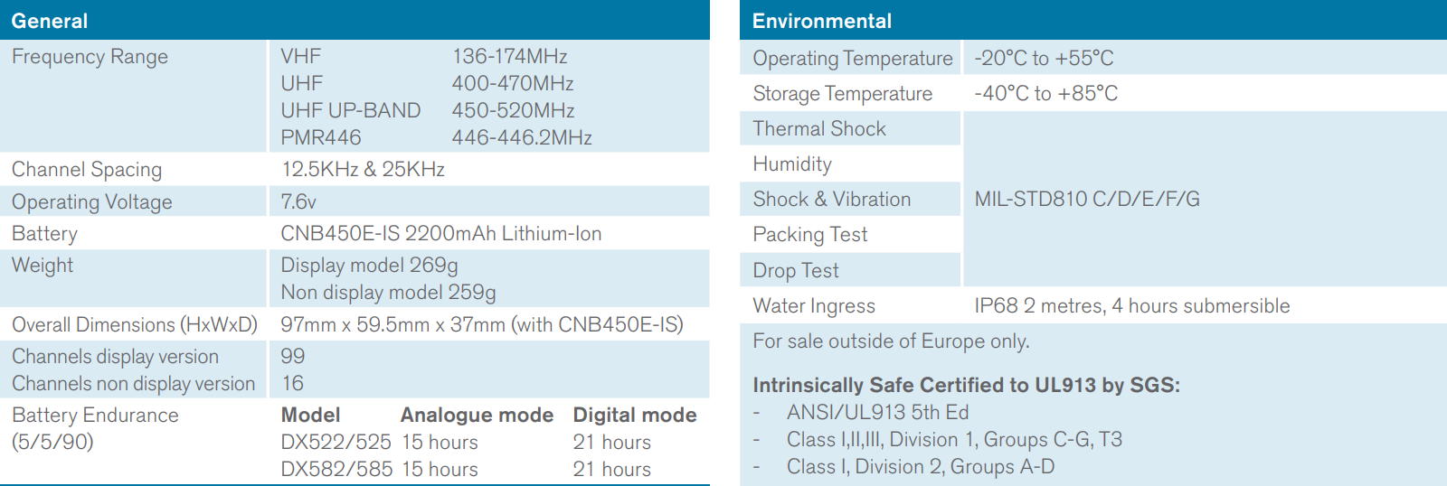 The commercial grade DX-IS Series offers both analogue and digital modes of operation, high visibility OLED display, high torque ergonomic controls designed for gloved-hand use, and industry-leading IP68 2m 4 hours submersible rating, to provide excellent reliability and usability even in the most extreme conditions. Whether you need a basic entry level radio or advanced digital features our DX-IS Series models deliver smart solutions, helping you to increase productivity and keep your business connected.