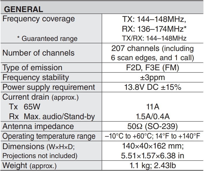 The IC-2300H can generate 65W of output power. The rugged aluminum diecast provides effective heat dissipation and keeps RF output even during high duty cycle continuous transmission.